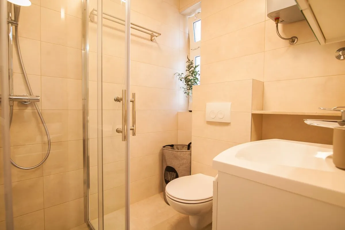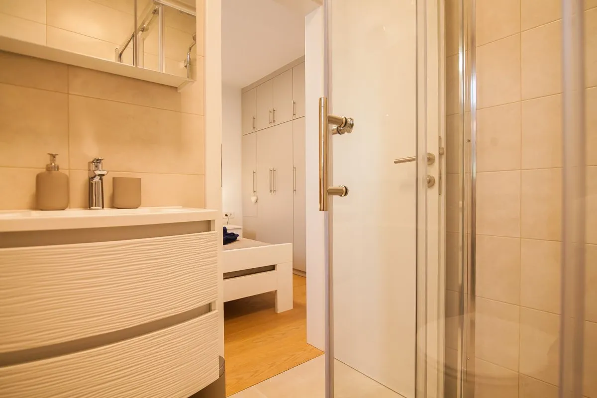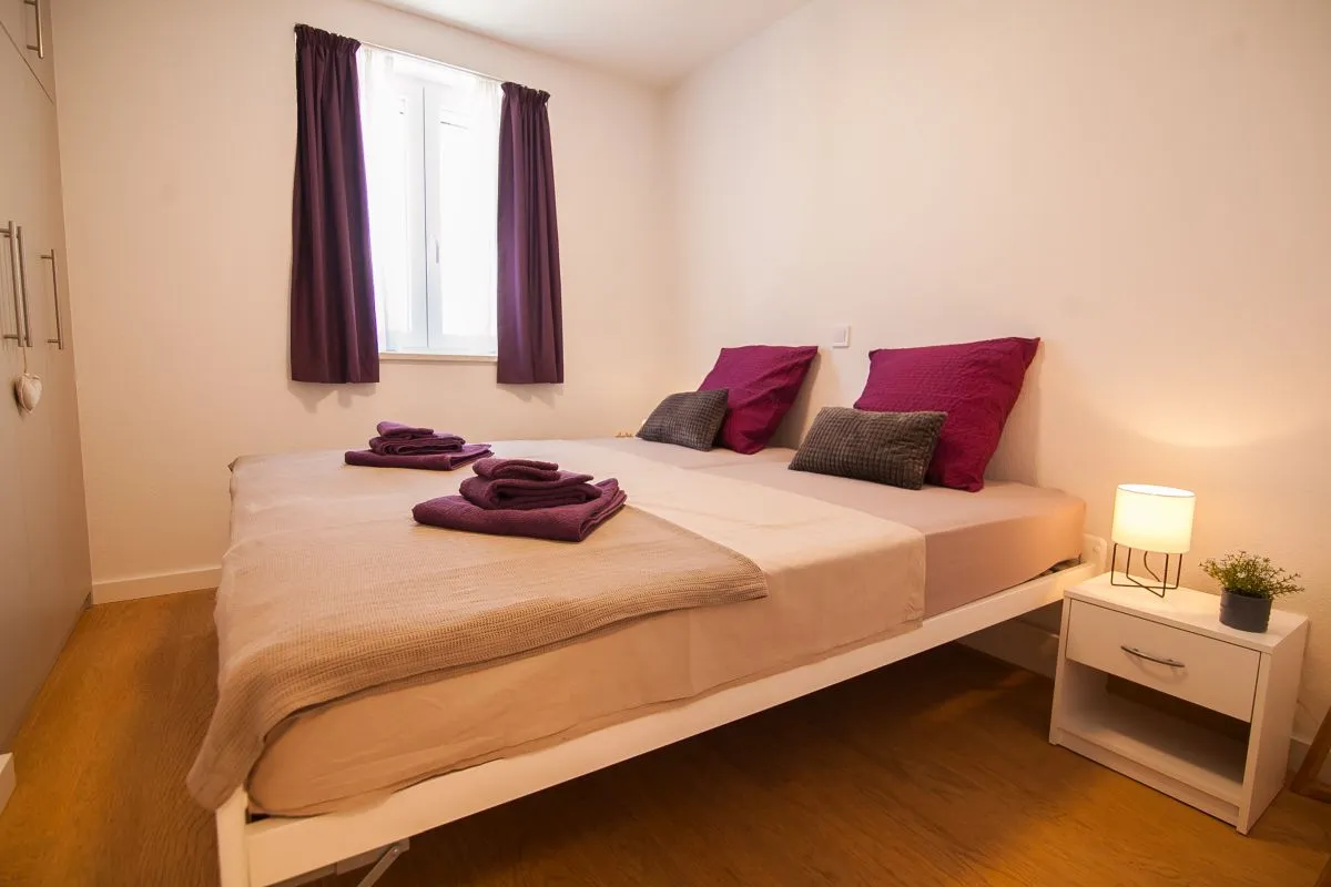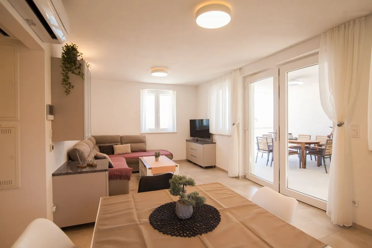 Newly built modern 3-bedroom apartment in the center of Bol. This top-quality air-conditioned apartment accommodates up to 6 people and it is located in a renovated house. It consists of two bedrooms with super king-size beds and one bedroom with two single beds. Each bedroom has a wardrobe and SAT TV. There is a living room area that has a large sofa, SAT-TV, and WiFi, a dining area with a table that can be extended for 6 people, and a modern and fully equipped kitchen with all the appliances and utensils you might need. The apartment has two full bathrooms, of which one is en suite and one has a washing machine. The best feature of the apartment is the outside area, with a table and chairs for 6 and a summer kitchen with an electric grill and a refrigerator.