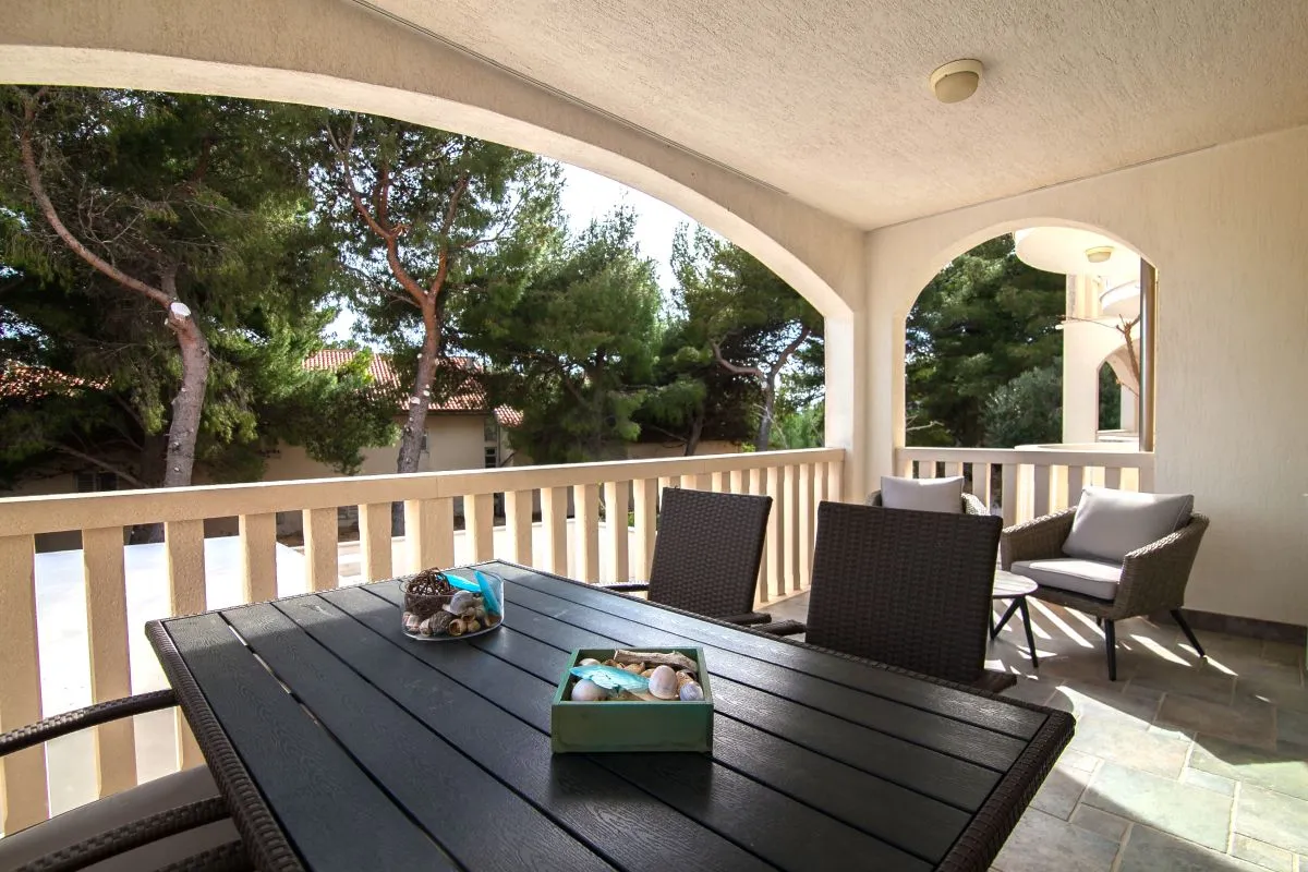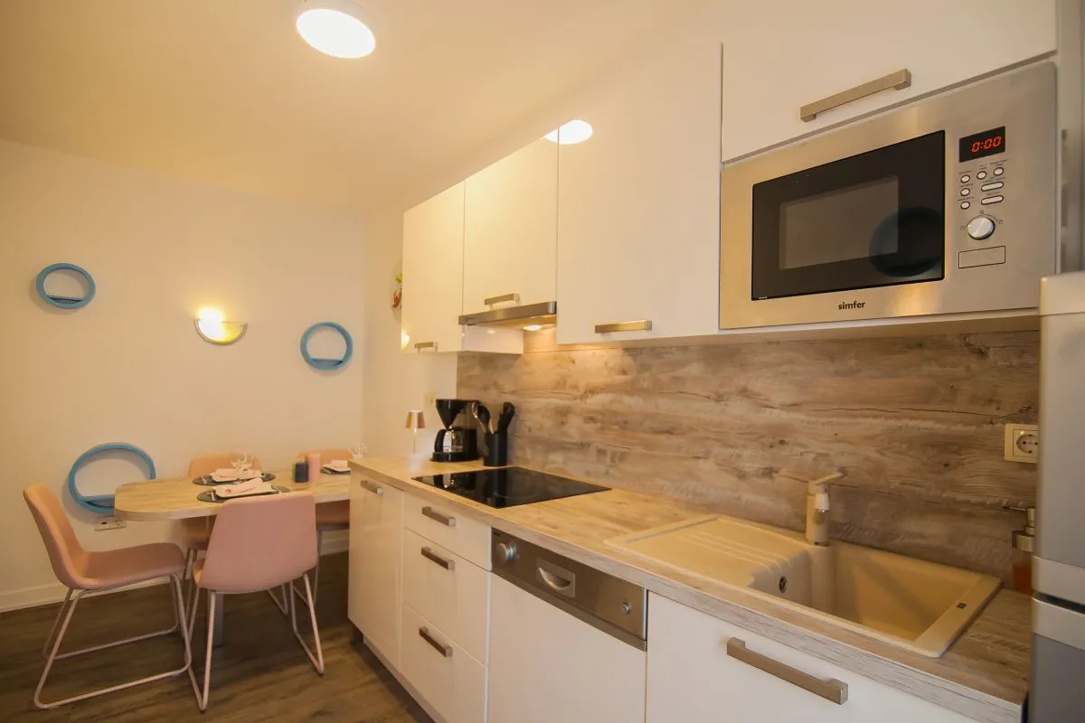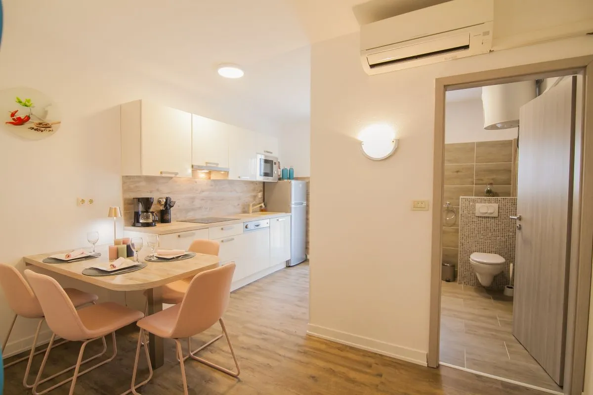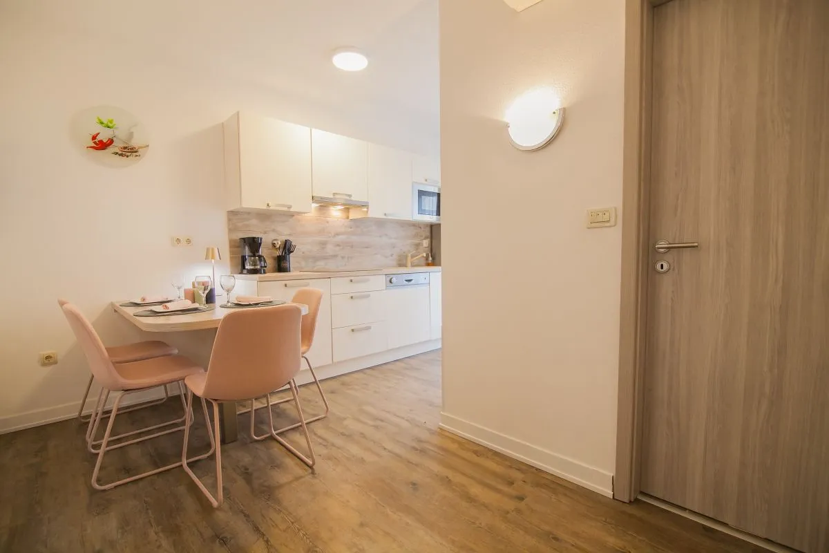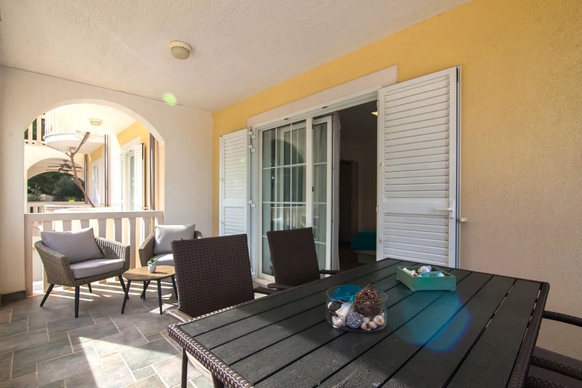 This comfortable two-bedroom apartment, located just 150 meters from the nearest beach, can accommodate up to four guests. Positioned on the first floor, the apartment features two bedrooms, a kitchen/dining area, a bathroom with a shower, and a large terrace equipped with a table and chairs, a lounge set, and a sun lounger. Additionally, there is a small balcony accessible from the main bedroom.